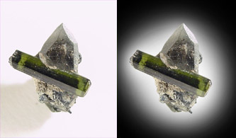 The raw image on the left was taken on a plain white background. I find this is best to illustrate translucency in crystals. The final image on the right has the background vignetted to black around the edges. If you look at the mineral portion of the photograph you will find no difference. So another of my secrets has been revealed. I welcome viewer comments on whether this technique is misleading. I do it so the web pages look nice. If the web pages had a white background then my technique would change.