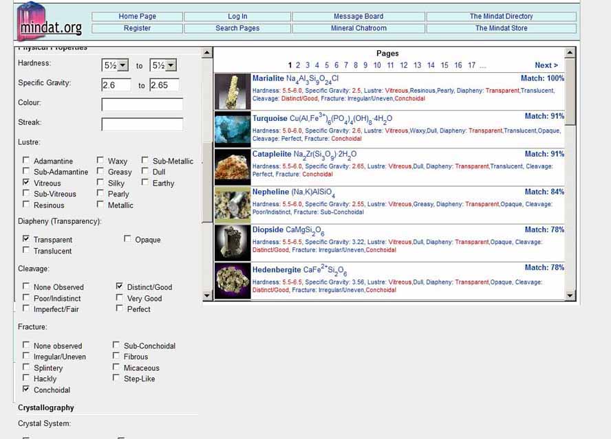 The search page shows on the right column the mineral species that match these characteristics and shows Marialite, a scapolite group mineral, closely corresponds to those attributes. This confirmed the identification that I suspected and eliminated gem albite-orthoclase which was a possible alternate.