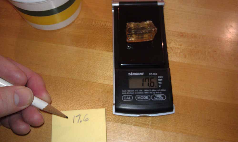 Testing for specific gravity with this method is fast, easy, and accurate. Best of all it requires no expensive equipment. In the future, when you are confronted with an unknown mineral species, try this test and you will be amazed at how helpful the results are at narrowing the possibilities.