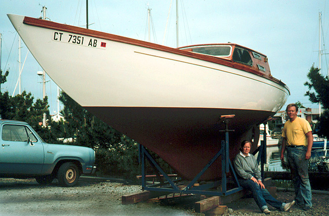 This is a similar view of the exterior on launch day. That is Judy and me as we wait for the big travelift to come over and pick up the boat to lower it into the water. Hard to see in this photo but we rebuilt the rudder, rudder post and all the bronze fittings below the waterline. Above the waterline the hull was smooth and fair. During the entire process only hand tools were used. Though some were power, we did not have the benefit of a table saw, drill press, or other common shop tools.