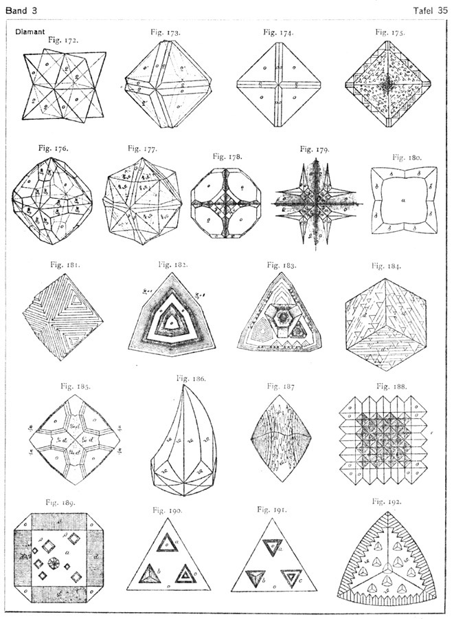 In 1916 Victor Goldschmidt published the nine volume Atlas der Krystalformen. It was a compilation of crystal diagrams from many books and references. Below are links to 300 dpi black and white scans of the 22 pages from the atlas containing diamond crystal drawings. Because the diamond drawings were derived from many different sources, the style varies from line drawings to shaded illustrations. Because these were scanned from a second-generation copy of the Atlas, the quality varies. But it is the most comprehensive collection of diamond crystal illustrations available.